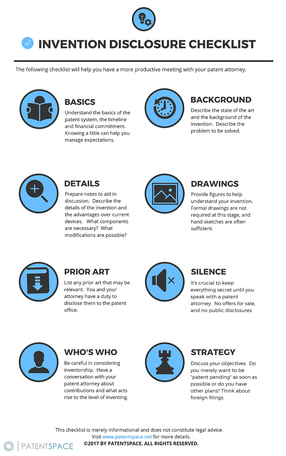 This invention disclosure checklist provides a high-level review of some details to consider when preparing to speak to a patent attorney about a new invention. Click on the image to obtain a high-quality PDF.